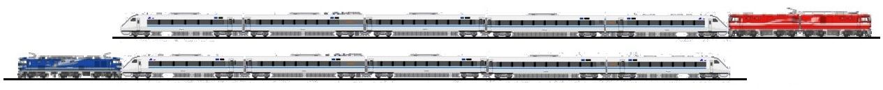 とは言え,動力台車が無ければ軌間変換が容易になることは想像に難くない。たとえばフル規格新幹線が完成するまでの繋ぎという位置づけなら,軌間変換可能な客車編成を機関車でPush-Pull運転することは,技術的には難しくないと思われる。下図の例※は,左が大阪方-右が金沢方を想定しており,下り列車については大阪~敦賀間を推進運転として,編成の金沢方には狭軌線用の運転室を備える。逆に上り列車では金沢~敦賀間が推進運転になり,編成の大阪方には新幹線用の運転室を備えるような,無動力の制御客車編成の開発を前提としている。