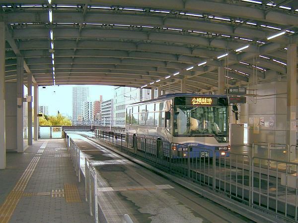 | ゆとりーとラインは日本初のガイドウェイバス路線として2001年に開業したが,他路線の追随が無く,案内輪の装置メーカーが撤退。このため既存の2-step車が更新できず,8000人超と言われる輸送密度に対応できない。元々将来的なAGTへの転換を考慮していたが,自動運転バス等への転換を検討中との報がある。狭隘な高架走行路の活用には,気仙沼線BRTで試行中の磁気マーカー等による左右方向の拘束が不可欠となる。写真は大曾根の転回場を折返した小幡緑地行。(2010.12) |